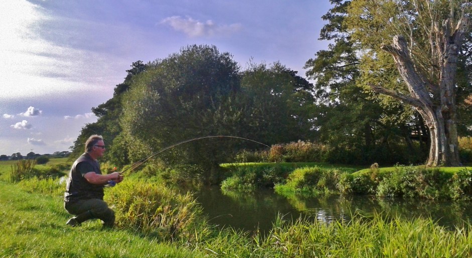 The deeper holes and clumps of streamer weed usually hold fish and I started by running a Gold Ribbed Hears Ear (GRHE) nymph over the holes and along the side of the weed beds. Half way down the pool, under a tree on the North bank, I had a thumping take and a good fish immediately jumped and then dashed off downstream. The little Hardy reel screamed in protest. The fish jumped a few times and it was a problem netting it, I need a landing net with a longer handle.
