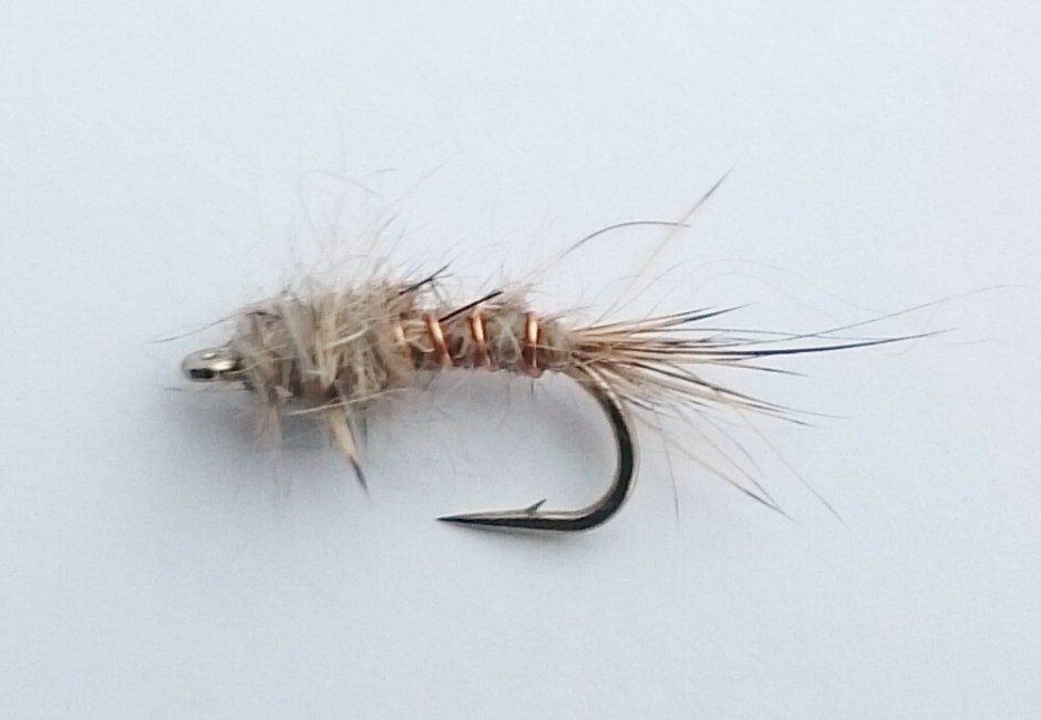 The modern pattern featuring a gold bead and wide gold ribbing is, in my opinion, a lure not a nymph. I don’t use beads. I use rabbit fur and various wire ribbings for this pattern. Rabbit fur is plentiful. Lead copper and gold coloured wire are cheap and more durable than tinsel or Lurex. The tail of the fly is made from the coarse guard hair which is pale brown with dark tips. The body is dubbed with a mixture of guard hair and the soft blue under fur. The ribbing sinks into the body which secures it and gives a segmented effect. Lead wire ribbing makes the fly sink and I sometimes add lead wire under the thorax for very deep pools. The thorax is mainly guard hair, loosely dubbed and picked out with a needle. I don’t bother with wing cases. This pattern should look scruffy and is more successful in sizes 12 and 14. I find trout take this fly confidently throughout the season.