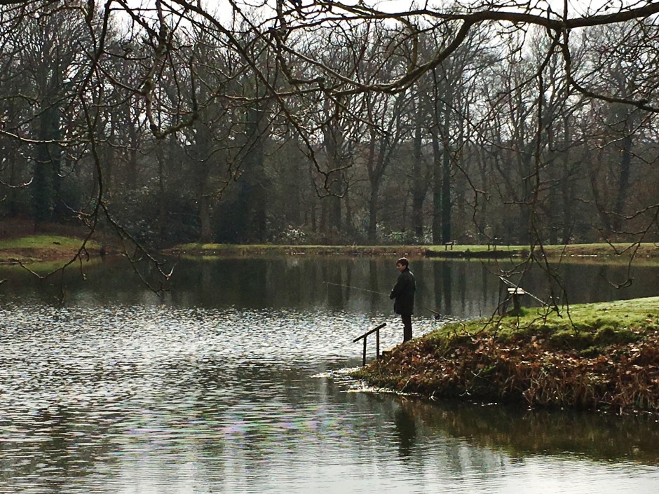 I woke to a bright but overcast sky. It was a foggy whiteness with no blue bits. It looked a bit chilly outside. The river season doesn’t start until April and I therefore planned to wander around the lakes and take some photos. As I drove to Petworth the sun came out. The hedgerows were lined with daffodils and primroses and the trees were just beginning to show a green haze of buds. When I got to Great Springs the southerly breeze was gently rippling the water, perfect fishing conditions.