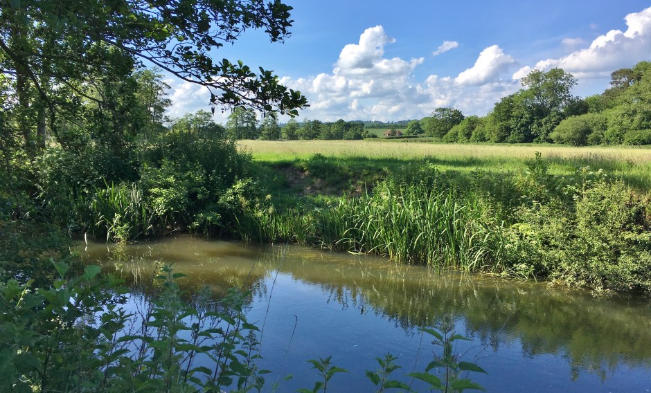 I was enjoying the shade and the breeze when a fish rose just upstream under a tree branch. I watched it rise several times and then tried to cover it. I lost the fly in the Alder tree. The fish continued to rise until I managed to get a Mayfly over it. Then the trout disappeared. My casting was not at it’s best. The heat and midges were getting to me so I strolled upstream along the headlands of a large open water meadow. The breeze was stronger there. I heard a splash in the big wide pool about a hundred yards above the old riffle. I sat and watched for ten minutes and only saw a Moorhen. I was just about to continue upstream when the fish rose again. In midstream just below a sunken tree branch. I had lost a few flies on that branch last season. I cast a Neoprene Mayfly over the trout a few times but there was no response. I went upstream and chased a trout along a stretch of river. It kept moving up, it was probably a sea trout. When I reached Perryfields Barn a diesel engine was thumping away feeding the water sprinklers. It was too noisy so I went back to the trout by the sunken tree. As I approached the pool it rose several times. I checked the knots, degreased the tippet and put the fly in the perfect place second cast. The trout swirled and I lifted into it. I bent the rod and hauled the fish out of the branches. It took the fish by surprise. By the time it was on an even keel it was in open water. It ran deep and pulled hard but it kept away from the snags. In the net it looked very long, it was about 2lbs 4ozs. It had a curly dorsal fin, not a wild fish.