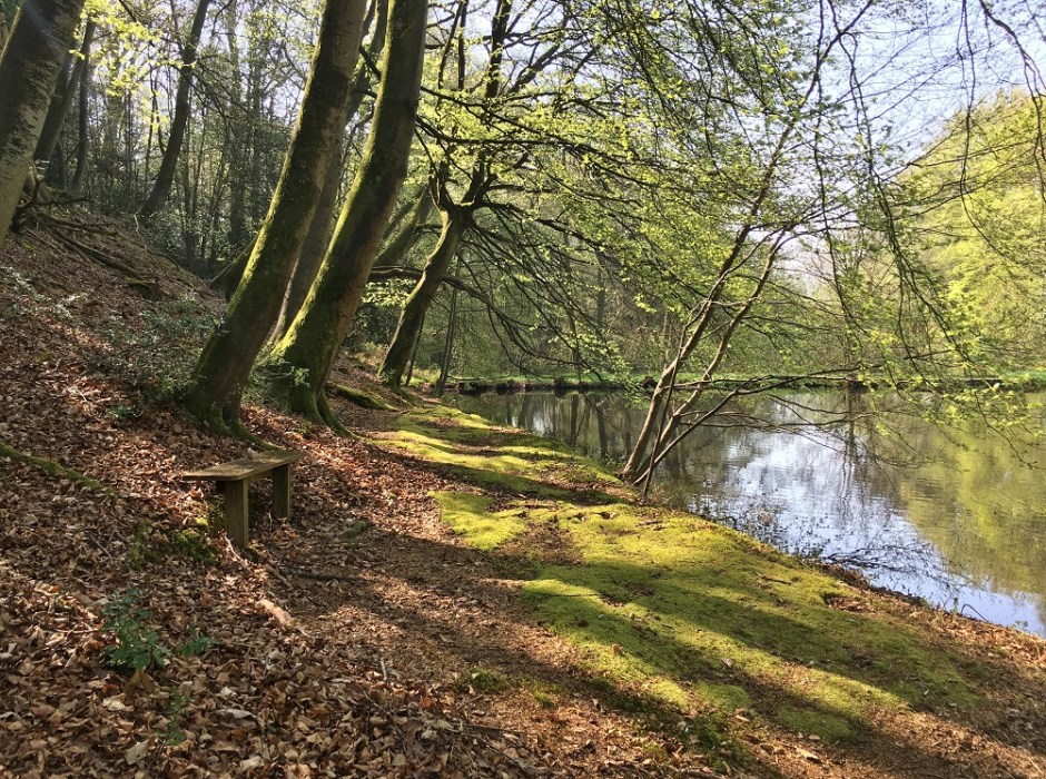 The hot sunny weather had persisted. The combination of Spring shoots, birdsong, flowers and the hot Summer sun felt strange. The context was wrong. I wandered around the lower lake at Little Bognor. The sun slanting down through the Beech trees was magical and I paused to admire the grand old trees. Beech are my favourite trees after Oak, perhaps it’s because the two woods are so hard and beautifully marked. I sat on the moss which was crunchy with Beech mast and watched the fish, they were very close to the bank. The top lake looks like a scene from a postcard but it is more open and doesn’t have the same mysterious atmosphere as its companion. Perhaps that’s why Sir Edward Elgar was attracted to the little lake under the trees.