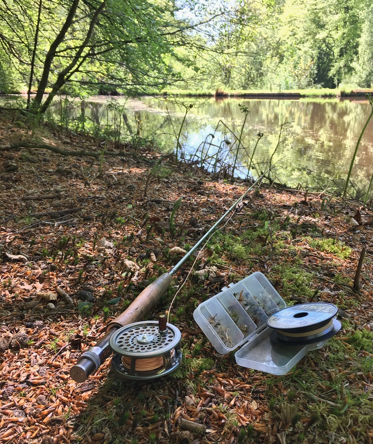 Little Bognor – I left later than usual, the local roads were clogged with Bank Holiday Lycramaniacs but once over the county border, the lanes were empty and I had a relaxing drive to Riverhill. I was looking forward to exploring the woods at Little Bognor. The sky was baby blue and the sun shining through the young Beech leaves made them glow bright green. I intended to explore the area but as I walked beside the lake several Trout were feeding close to the bank and the temptation was too great. I collected my rod from the car and settled down under the Beech trees close to the seat. I sat still for ten minutes, watching the fish under the bank. One was even feeding underneath the fishing platform. The steep sided valley, the ancient trees and the near silence created a magical atmosphere. It was easy to watch and wait.