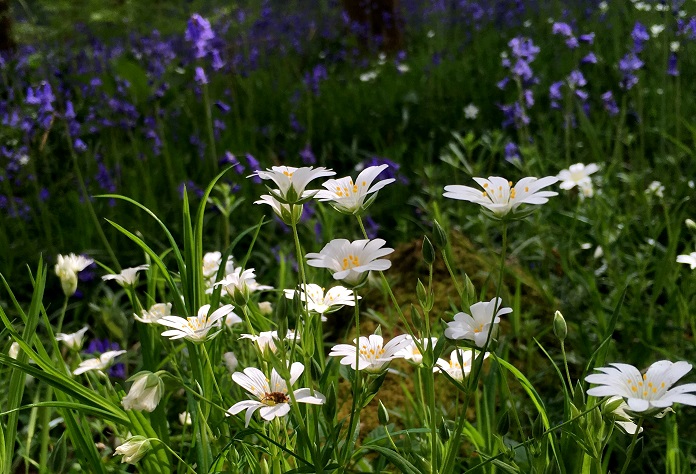 The forestry plantation along the old railway embankment was covered in bluebells and as I walked down the footpath towards the river, I crushed wild garlic leaves underfoot. It was a weird combination of smells, the sweet perfumed scent of the bluebells clashed with the harsh cooking smell of the garlic. I sat in the wood for a while watching the light change. The south-westerly wind was pushing storm clouds across the valley throwing pools of light on the spring flowers.