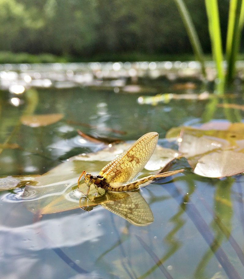 I arrived at the lakes at lunchtime and spent too long chatting. The cold North wind swept down Little Springs funneled by the tall trees. The few Mayfly that were hatching tumbled along the surface of the water and as they became airborne, were snatched away.