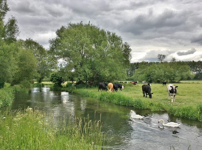 I consoled myself with a farm shop apple pie and chocolate biscuits. I resolved to maintain my concentration and to work harder. When I returned to the Hawthorn tree the cattle on the opposite bank were charging about and driving the swans off the bank, back into the water. The scene looked like a John Constable painting, the bend in the river reminiscent of ‘The Hay Wain’ without the horse and cart. I stood beside the tree, using the trunk to keep off the skyline. I waited until the cattle had moved away and the colour had settled out of the water before presenting the fly upstream, close under the bank. Success. A fish about two pounds put up a strong fight and eventually dashed away from the landing net.