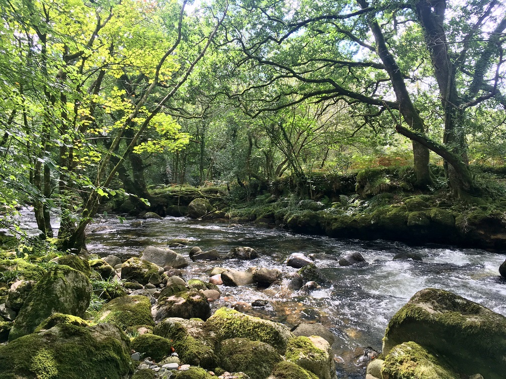 My first choice was like Butlins; campers, barbecues, dog walkers and swimmers. I drove further downstream, to the next bridge. There were a few dog walker’s cars but they had all gone upstream along the well trodden footpaths. I found a small gap in the overgrown hedge and clambered over a barbed wire fence. The ancient wood was quiet, even the birds were silent. Green lichen covered the trees and massive boulders were scattered around the woodland, put there by spates over hundreds of years. It was a bit spooky and I trod quietly.