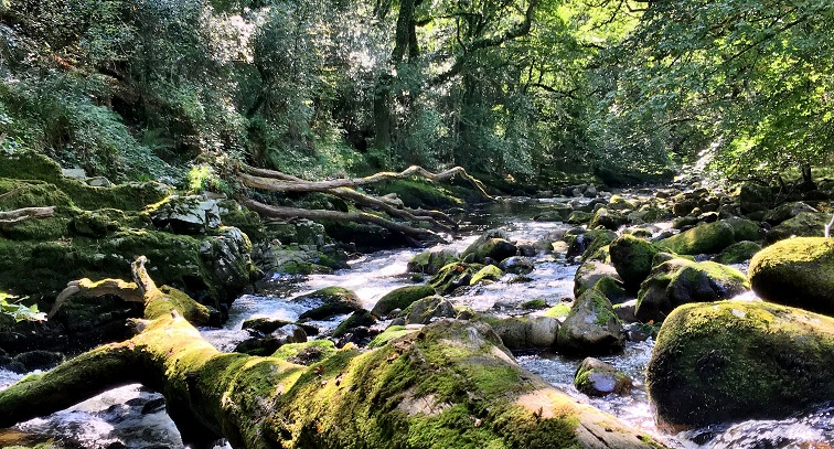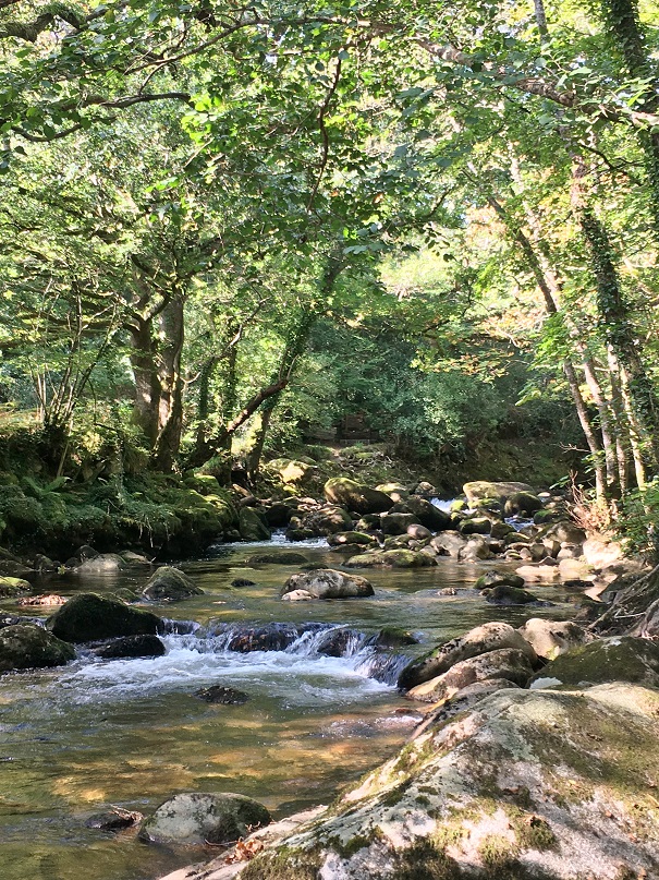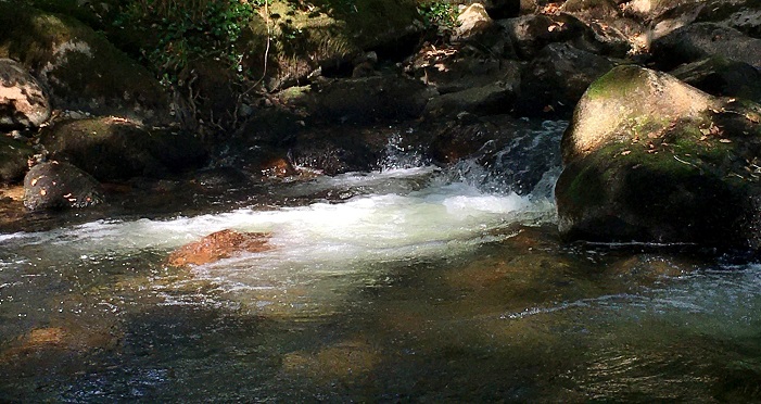 The sun was warm and bright, it illuminated the Hazel and Oak leaves. Acorns dropped into the pools from the centuries old trees. The foam in the throat of the pools glowed white and the various coloured rocks on the river bed looked like a tartan rug. The landscape looked like Spring except for the bracken which showed rusty brown under the tree canopy.