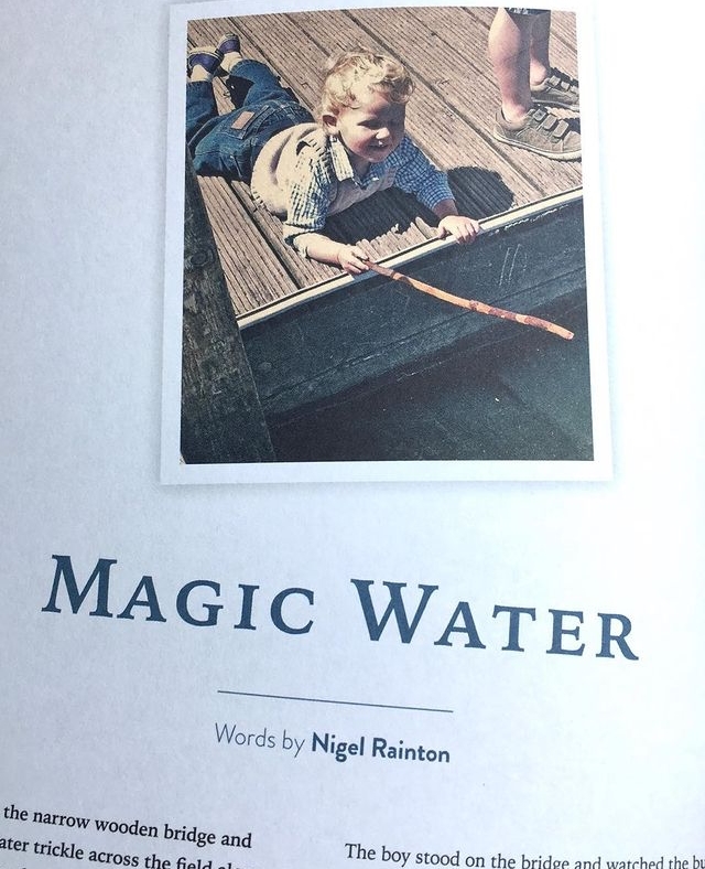 The toddler knelt on the narrow wooden bridge and watched the magic water trickle across the field along a seam between the sandstone and clay. The cool water felt good on his podgy little hand. It was comforting and connected him to another world. He watched the droplets fall from his fingers to re-join the young river on its journey to the sea. He stretched out his arm and tried to catch the little silver fish but they were too quick for him.
