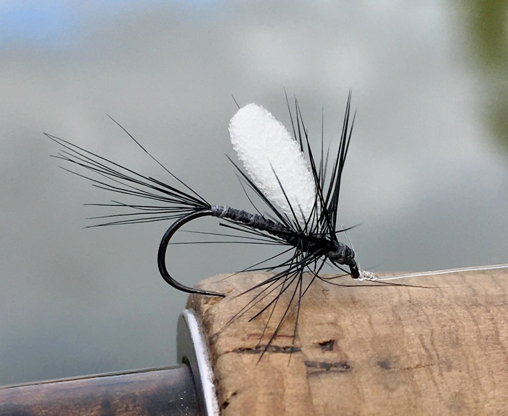 I walked back to the car and was about to leave when the wind died, the sun shone and the Trout started to feed again. I watched the water but I couldn’t see anything on the surface. I thought the fish were probably taking buzzers as they emerged. I tied on a size 14 black fly with a white ethafoam wing which would float for ages. First cast to a rising fish produced a confident head-and-tail take and another fish in the landing net.