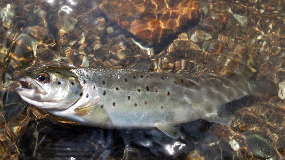There was no sign of trout, in the broken water it was difficult to be specific about any surface movement. The pool was deep and rocky, four to five feet of water rushed around submerged boulders the size of dustbins. The crevices held trout but they were not rising. A long leader and a weighted GRHE nymph was the answer. I had a tap on the rod first cast, along the bankside drop-off and a gentle pull on the line second cast. Slightly further down the pool in slack water, a trout grabbed the nymph and went airborne. It looked like a sea trout smolt which I released without touching the fish. I wished it well. A good start to the day. As I stood up to walk downstream a fish rose only a rod length from me. I sat down and drifted a dry fly over the fish but there was no response.