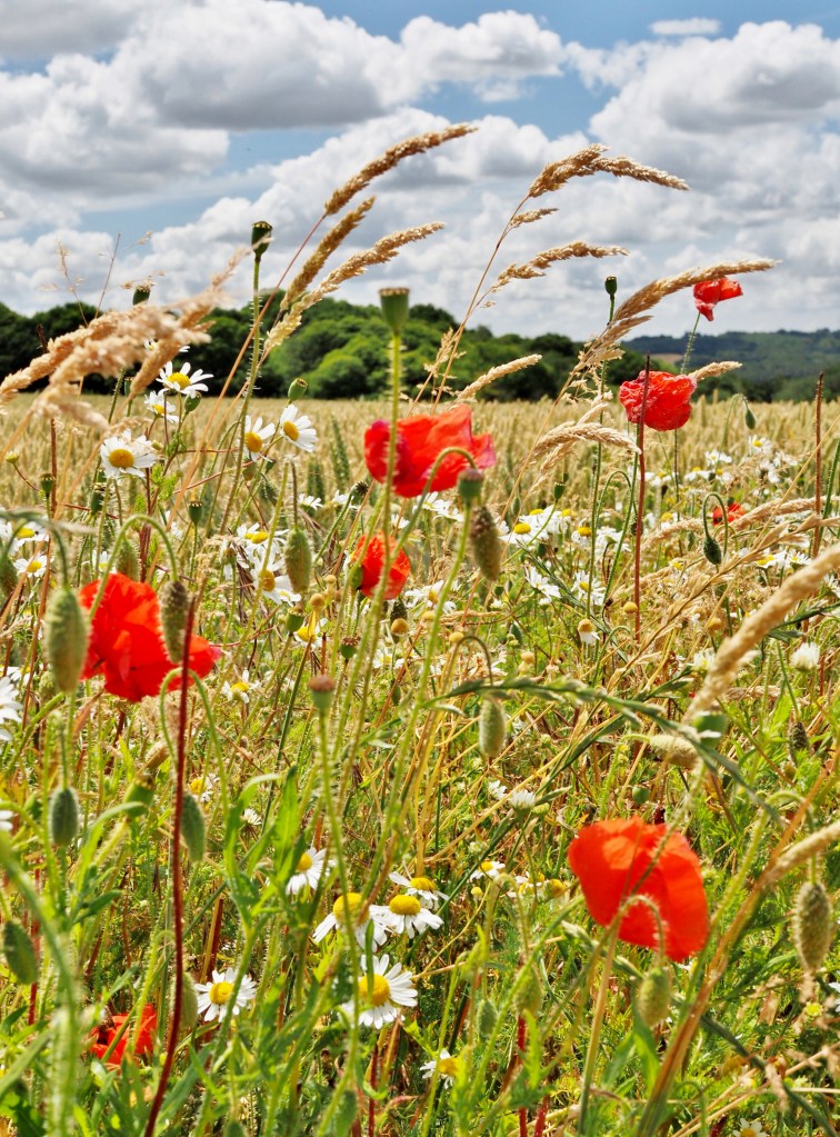 I left the river, content that I had persevered in difficult conditions and that I had caught a good trout. I drove to Stag Park to admire the view and to check out the lakes. The landscape was stunning. The blue sky held a constant flow of fluffy white clouds which switched the sunshine on and off as they passed overhead. The cereal crops brightened the landscape and the headlands were full of wild flowers. The Sussex countryside was at it’s very best, softer than Dartmoor but equally impressive.