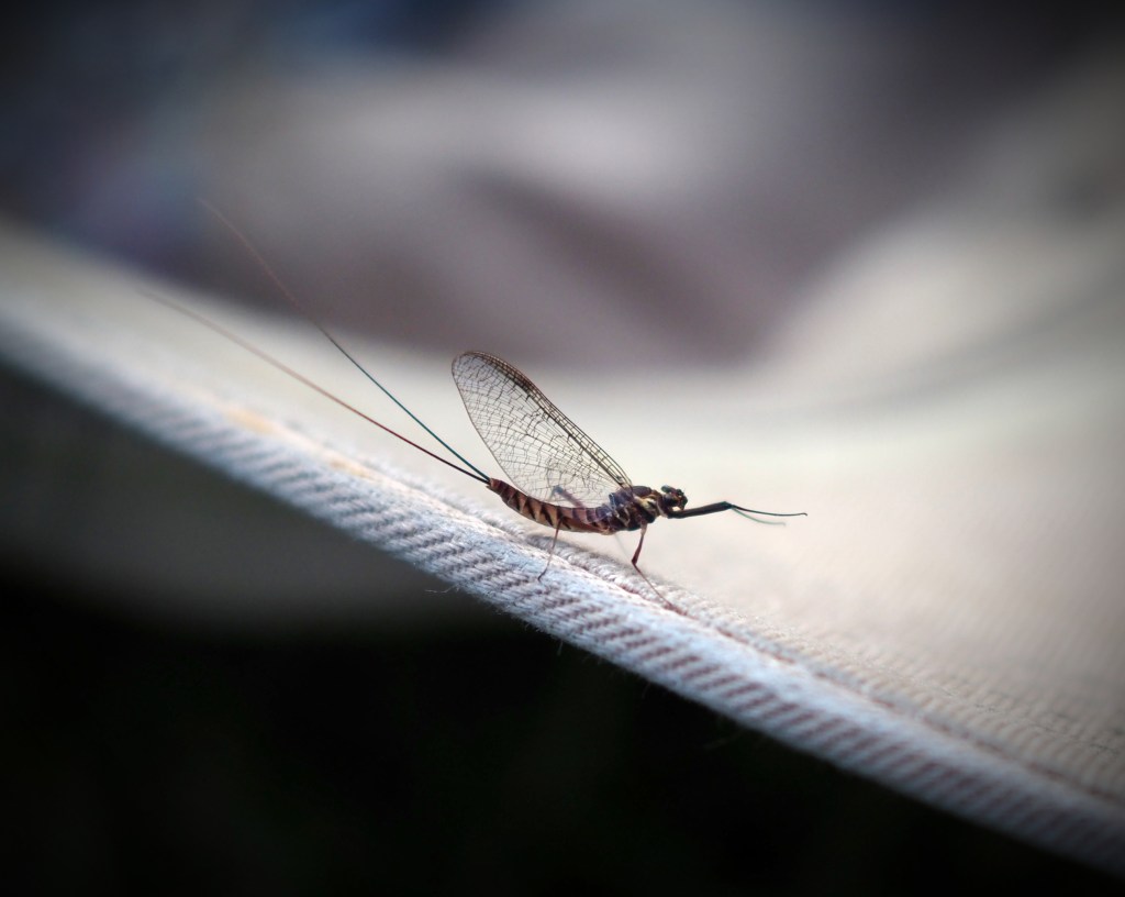 During my walk back upstream an olive spinner landed on my insect repellant soaked hat and waited for me to adjust the camera. The fumes must have anaesthetised it. The spinner posed nicely and then flew away. Later at the cottage, I tried to identify the species from a reference book but after a couple of glasses of wine they all looked the same.
