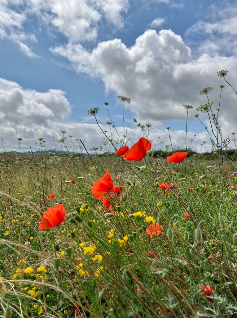 I stopped at Stag Park to admire the landscape and the wild flowers. The fields had been sown with clover and the pink sheen extended to the near horizon, only interrupted by strips of cover crop. The scent from the lime trees around Little Springs was strong and the flowers were covered with bees and wasps.