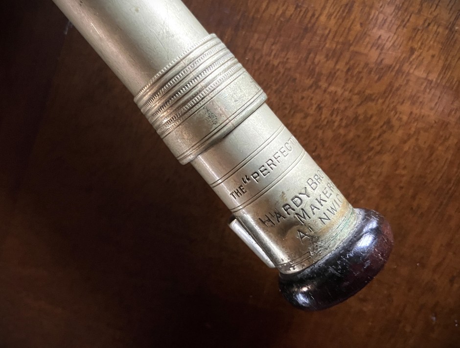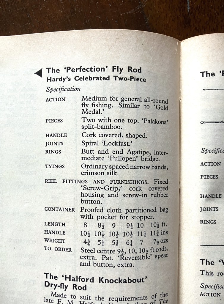 The reel fitting was of a strange construction and the ferrule had a seam along its length. The reel fitting and ferrule had been fashioned out of sheet metal, rolled into a tube and the seams soldered together. The 1955 Hardy catalogue describes the rod, the specification of which had changed since 1913.