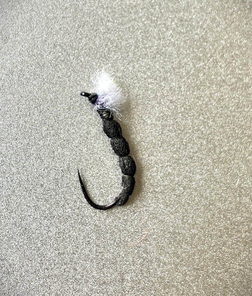 I crouched down, away from the water, to flick a buzzer at passing trout. The heavy tippet was visible in the clear water and after an hour I changed it and rubbed off the shine with damp moss. I caught three trout, one of which was fin perfect and may have been a wild fish. I eventually lost the buzzer attempting an impossible cast through a vertical slot in the overhanging branches.