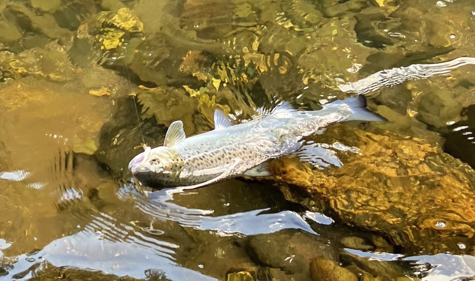 The north-west wind persisted but I was sheltered in the deep valley amongst the trees. I walked upstream to the pool where the dogs bark at me. Two very polite young lads joined me on the beach and we chatted about the river. The dogs charged across the field, barked for a while and then left me in peace having defended their territory. I caught a very silver fish in the tail of the pool. Possibly a smolt. I unhooked it in the water without touching it and it sped away.