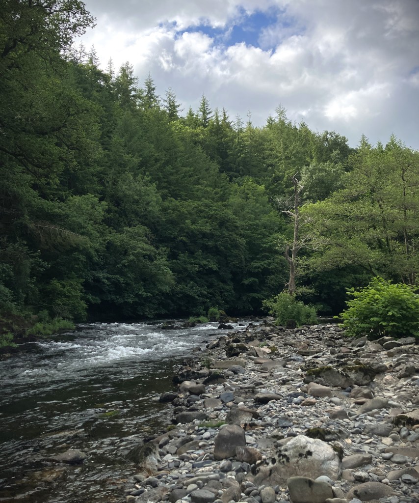 I couldn’t hear the river from the top of the hill and left the rod in the Defender, expecting low water levels. I scrambled down the hill through bracken, gorse and mature trees, taking care not to fall. The river was very low and there was hardly any flow.